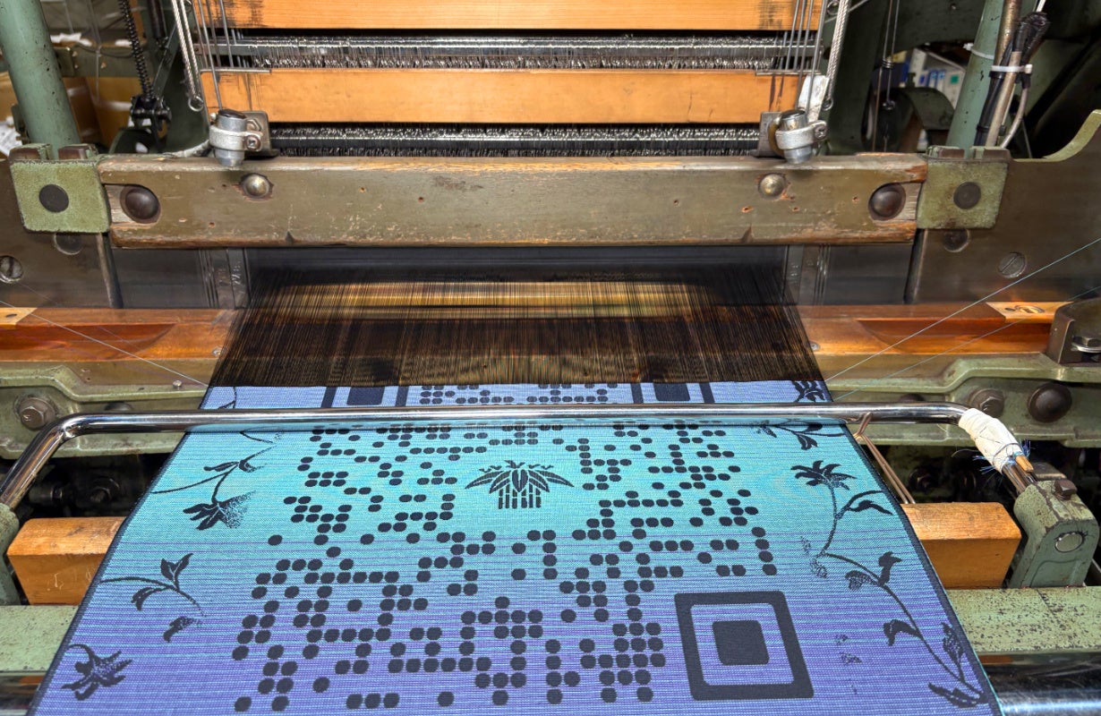伝統工芸西陣織で織り上げたQRコードを完全オーダー生産。中央にロゴも入ります。