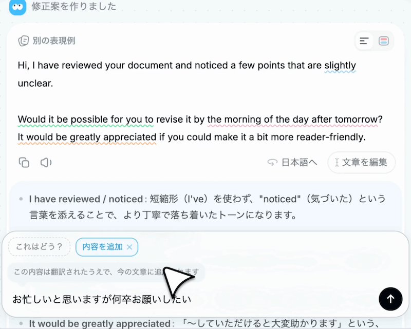 たとえば英語の文章に追記したいときに日本語で内容を入力すると、英語に翻訳したうえで適切に追加してくれます。