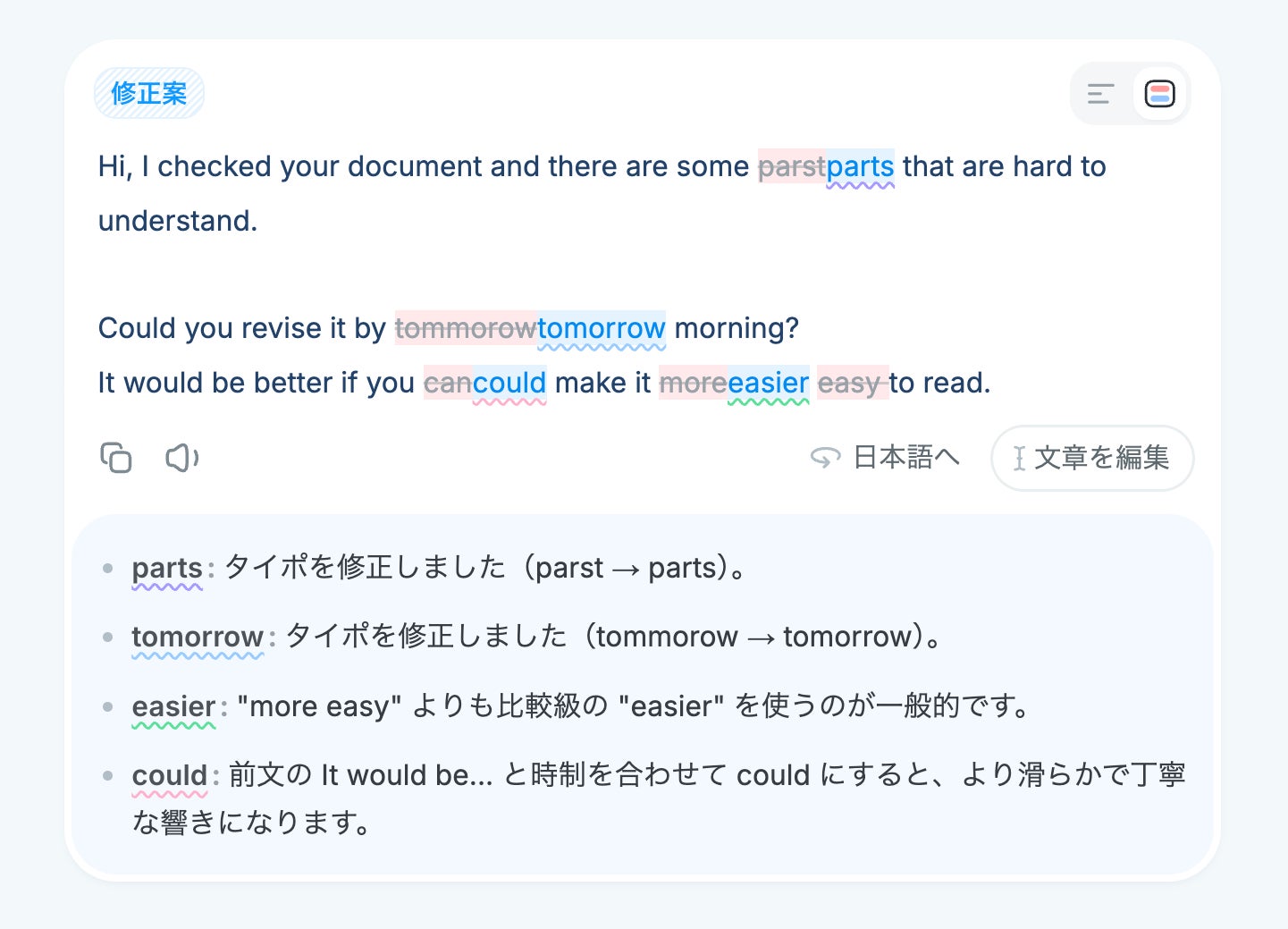 修正すべき点があればハイライト表示され、修正案もあわせて提案されます。