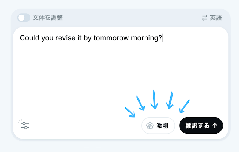 通常の翻訳と同じように文章を入力した後、「添削」ボタンを押すことで添削が開始されます。
