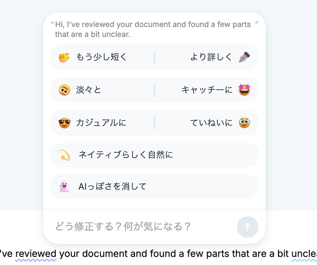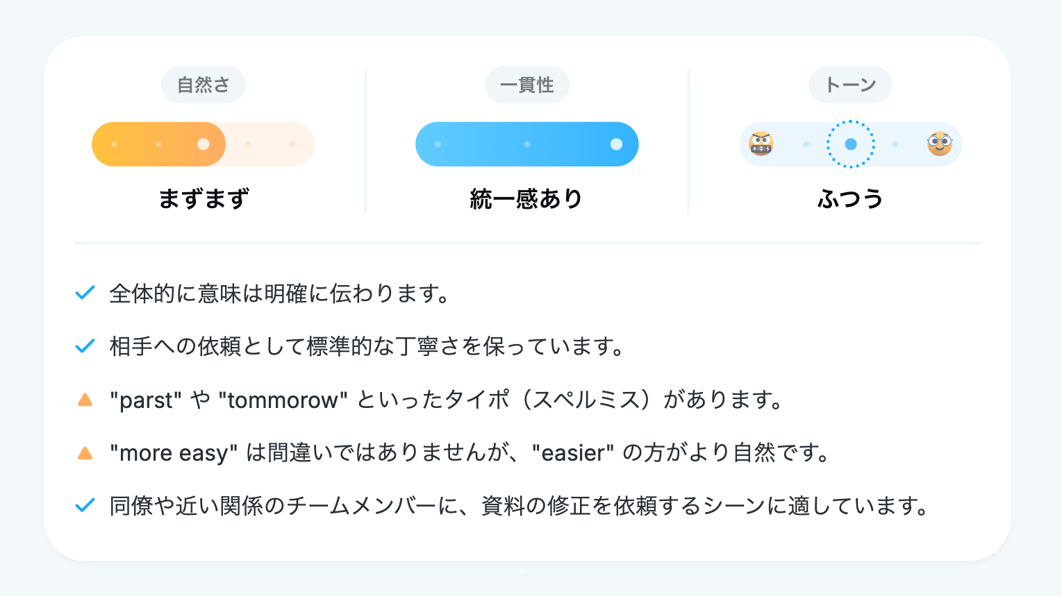 これにより、文章トーンが適切か、あるいは文体が混在していないかといった、ネイティブから見たときに不自然なポイントをすばやく把握できます。
