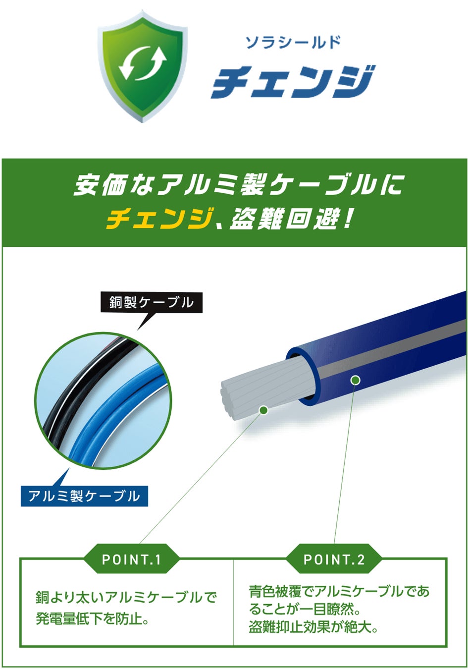 ソラシールドは、【一律低価格】【発電所タイプ不問】【全国対応】を実現した、低圧太陽光発電所に特化した銅製ケーブルの盗難対策ソリューションです。