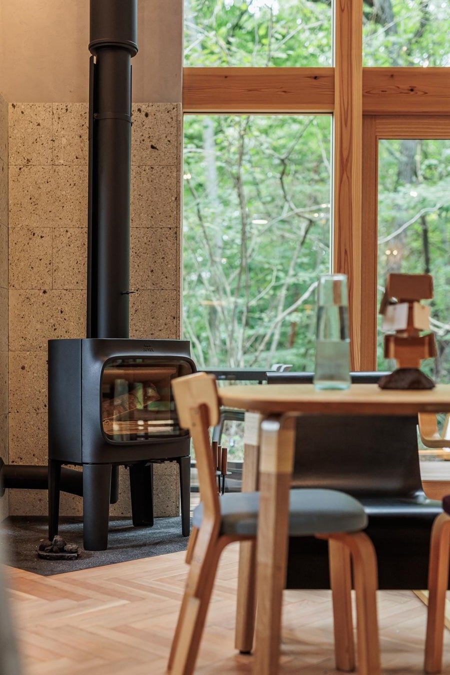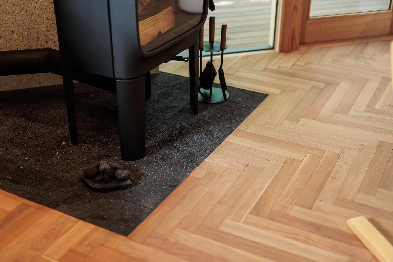 床はチェリーのヘリンボーン貼り、薪ストーブ周りの床には浅間石を加工して使用し、背面には大谷石を施工。床から天井まで、地域の素材が細部に活かされています。
