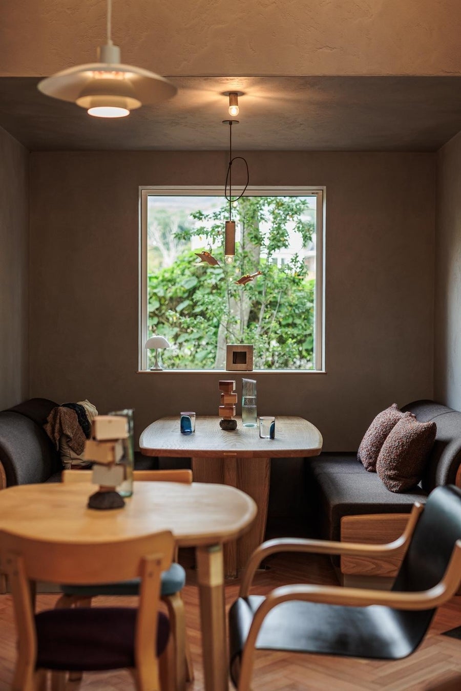 住宅と同様に、自然環境との調和と素材の質感を重視した設計が行われています。照明にはルイスポールセンを採用し、家具は地元家具工房の作品やアアルトの名作を組み合わせています。