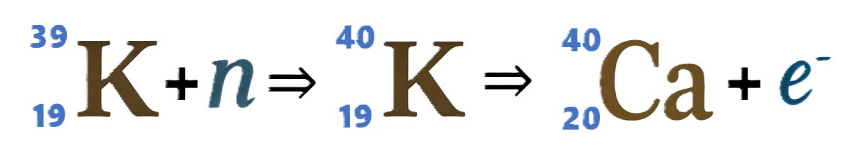 カリウム40(K-40)は、自然界では約0.01%存在する放射性同位体(A)。
