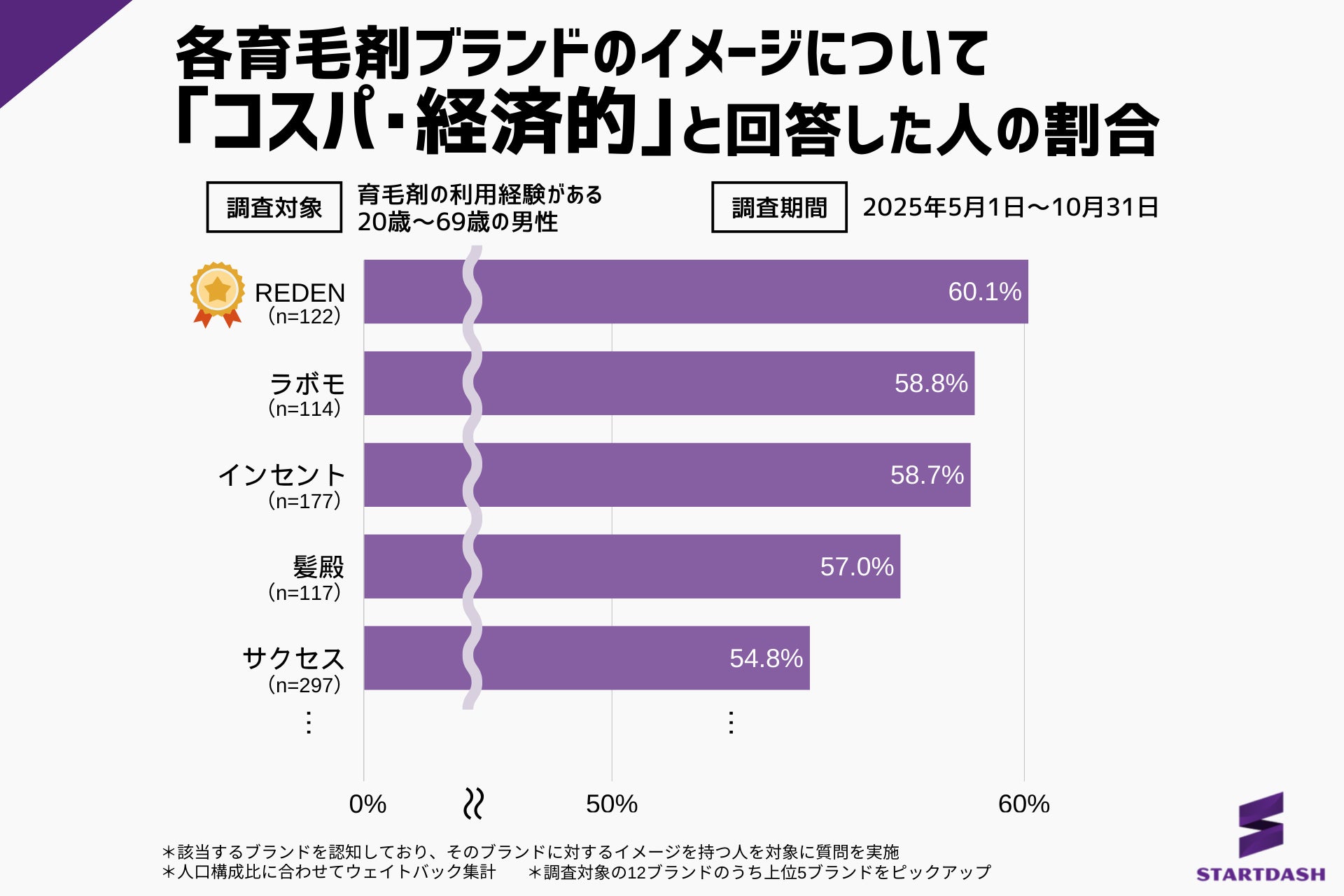 「コスパ・経済的」のイメージが当てはまると回答した割合は、『REDEN』が60.1%でトップとなりました。2位の『ラボモ』は58.8%、3位の『インセント』は58.7%、4位の『髪殿』は57.0%、5位の『サクセス』は54.8%となっています。