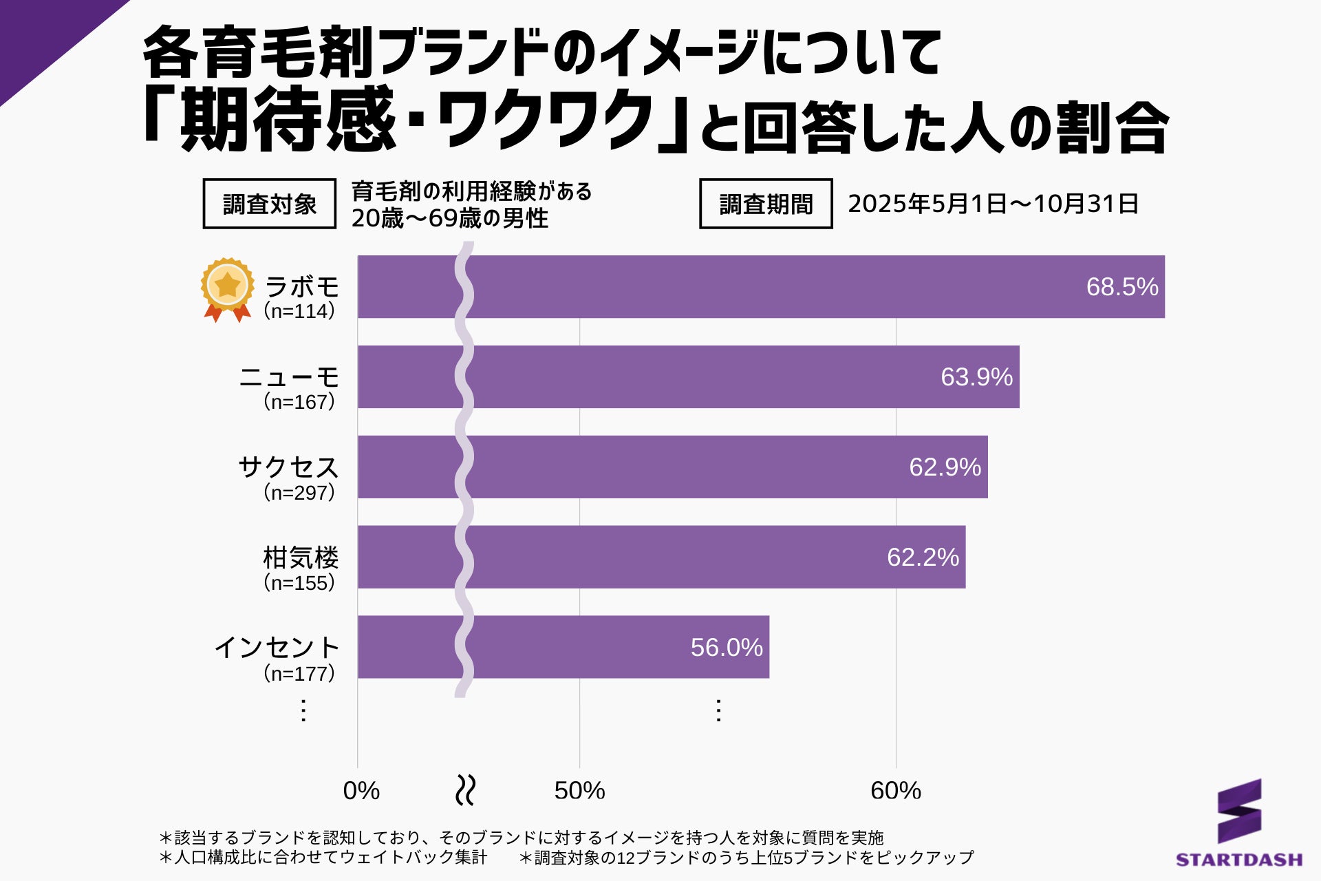 恋愛相談SNSアプリ「kyuun(キューン)」を開発・運営するSTARTDASH株式会社( https://startdash.co.jp/ )(本社:大阪府大阪市、代表:田中将)は、男性の育毛剤選びのヒントを探るため、育毛剤の利用経験がある20代~60代男性を対象に、主要な育毛剤に関するイメージ調査を行いました。