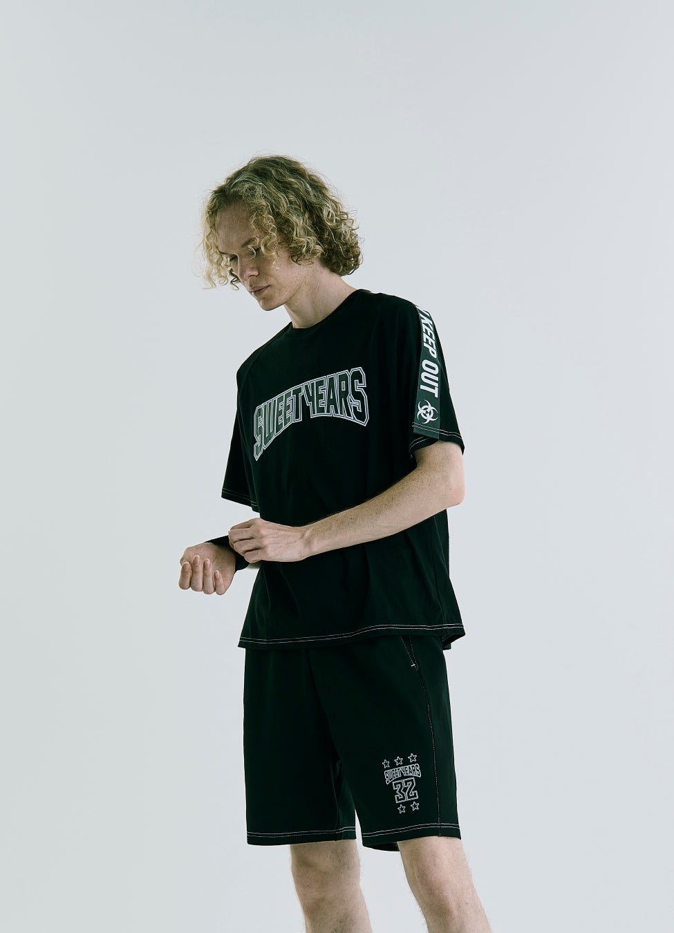 バックには大きく32の背番号のグラフィックを配置。両袖にはKEEP OUTテープのグラフィックを贅沢に配置しました。