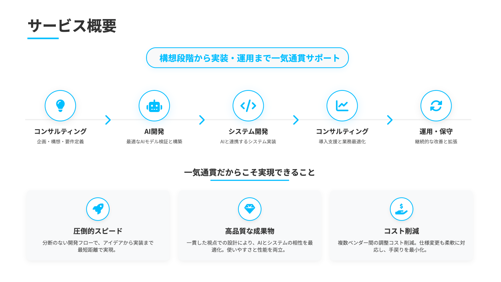 机上のAI活用ではなく、成果に直結する実装力が強みです。 -
