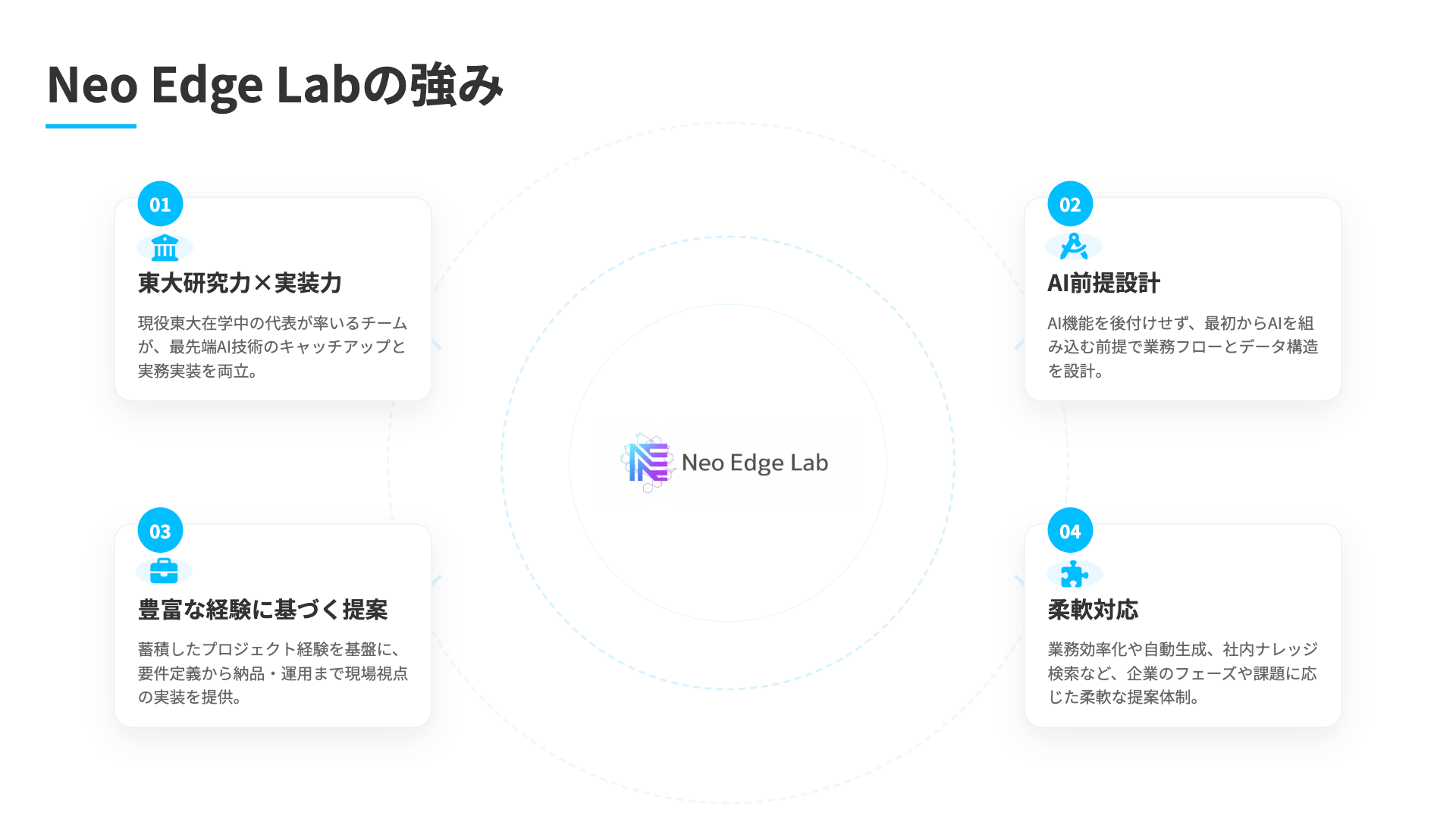 「Neo Edge Lab」は、東大発の研究知見と実装力を活かし、AI・システム導入を検討する企業へ、構想段階からシステムの開発・導入まで一気通貫の開発支援という新たな選択肢を提供します。