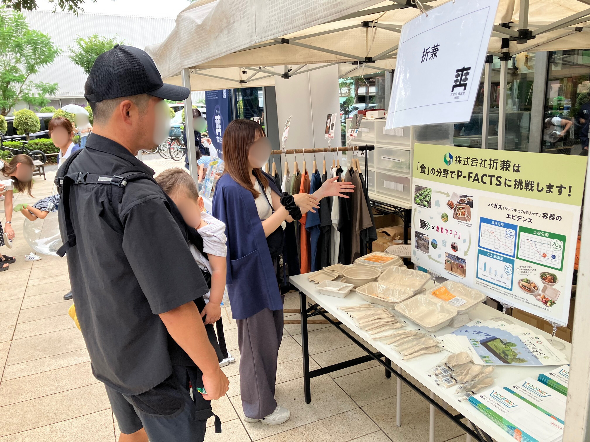 持続可能なお祭りを目指すための、代官山 爽涼祭 2025の思いに共感し、折兼ではサステナブルな循環インフラ「P-FACTS(ピーファクツ)」を紹介。来場者にはエコなカトラリーをプレゼントし、さらに使用済みバガスカトラリーを土に埋めて分解する取り組みを行いました。