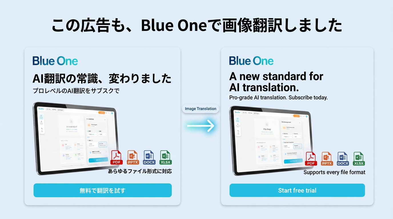 BLUE ONEは、テキスト・ドキュメント翻訳に加え、画像翻訳の正式リリースにより、あらゆるコンテンツ形式をカバーするAI翻訳プラットフォームへと進化しています。今後も対応フォーマットの拡充と翻訳品質の向上を継続してまいります。