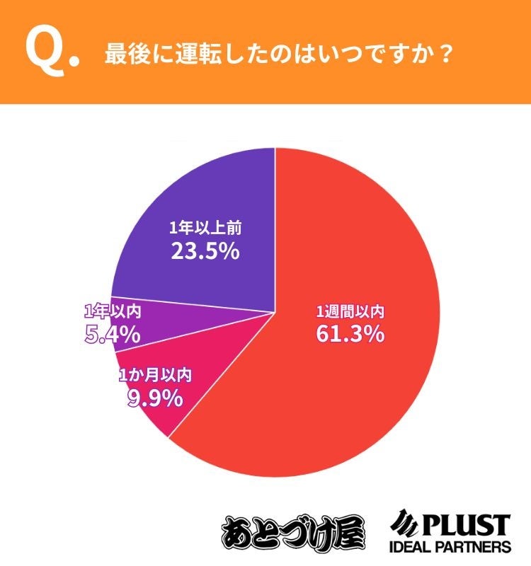 運転経験があると回答した720名に「最後に運転した時期」を尋ねたところ、最も多かったのは「1週間以内」(61.3%)となりました。半数以上が日常的に車に触れており、運転が生活の一部として定着している様子がうかがえます。
