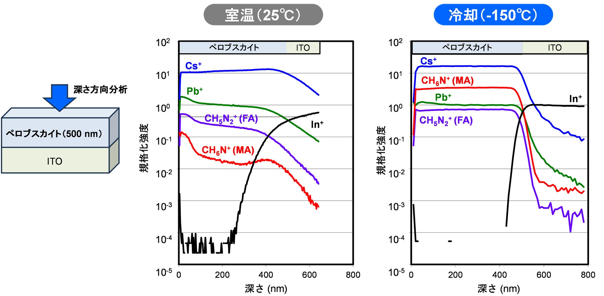 冷却下での測定(右図)により、ペロブスカイト材料の構成成分であるホルムアミジニウム(FA)やメチルアンモニウム(MA)などの低分子有機成分の揮発が抑えられ、二次イオン強度が安定し、ペロブスカイト層の本来の構造を忠実に反映した深さ分布が取得可能となりました。さらに、深さ方向の分解能も従来の常温測定と比較して大幅に向上し、層構造の界面をより明瞭に捉えることができます。