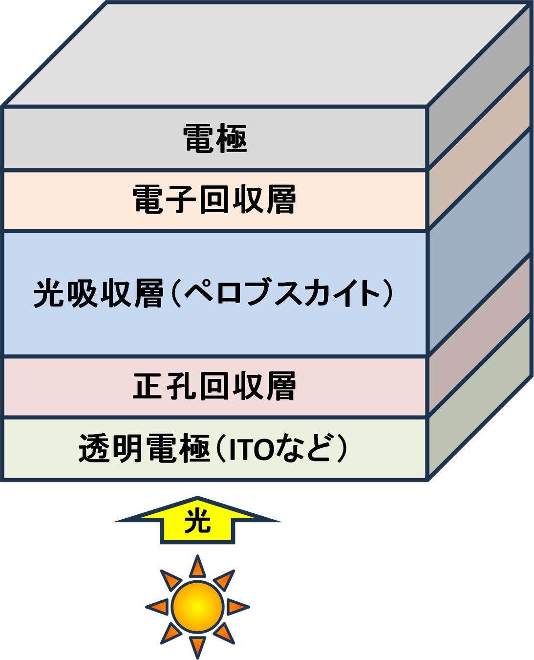 太陽光を吸収して電荷を生成する層。ペロブスカイト材料が用いられ、光吸収と電荷分離の中心的役割を担う。