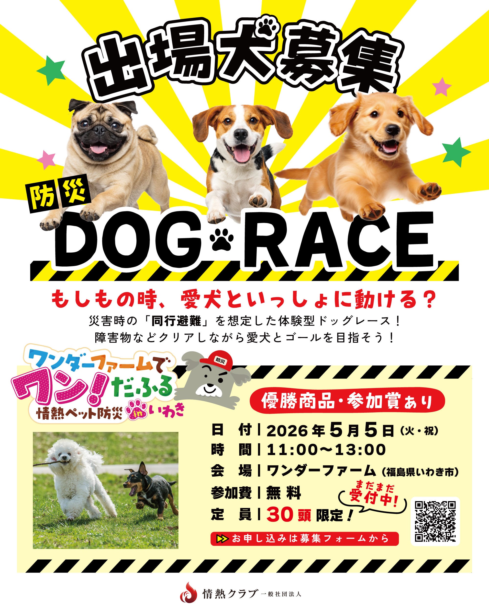 ドッグオーナー・ファミリーへ向け、ペット防災・食・心のケアをテーマにした体感型イベント「ワンダーファームでワン!だふる 情熱ペット防災 in いわき」を開催いたします。