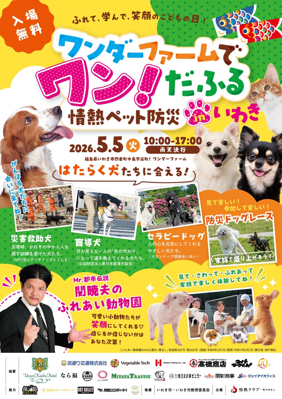 Mr.都市伝説 関暁夫も参加!【福島県 5月5日(火/祝)開催!】親子で楽しめる体感型防災イベント「ワンダーファームでワン!だふる 情熱ペット防災 in いわき」【スポンサー企業/スケジュール決定】
