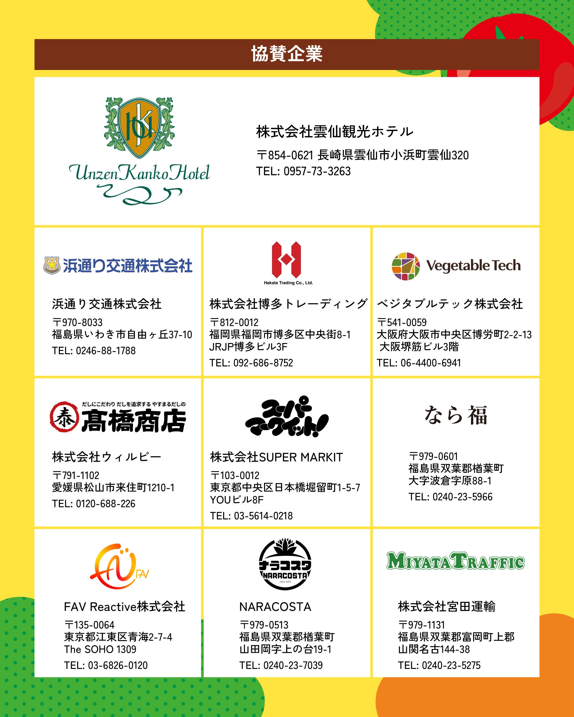 株式会社雲仙観光ホテル・株式会社ウィルビー・ベジタブルテック株式会社・株式会社博多トレーディング・浜通り交通株式会社・NARACOSTA・なら福・FAV Reactive株式会社・株式会社SUPER MARKIT・株式会社コミットコーポレーション・株式会社宮田運輸・株式会社門崎・株式会社東日本計算センター・関彰商事株式会社・株式会社かねまん本舗・株式会社ジェイアイオフィス・one zu gate・株式会社日章冷凍
