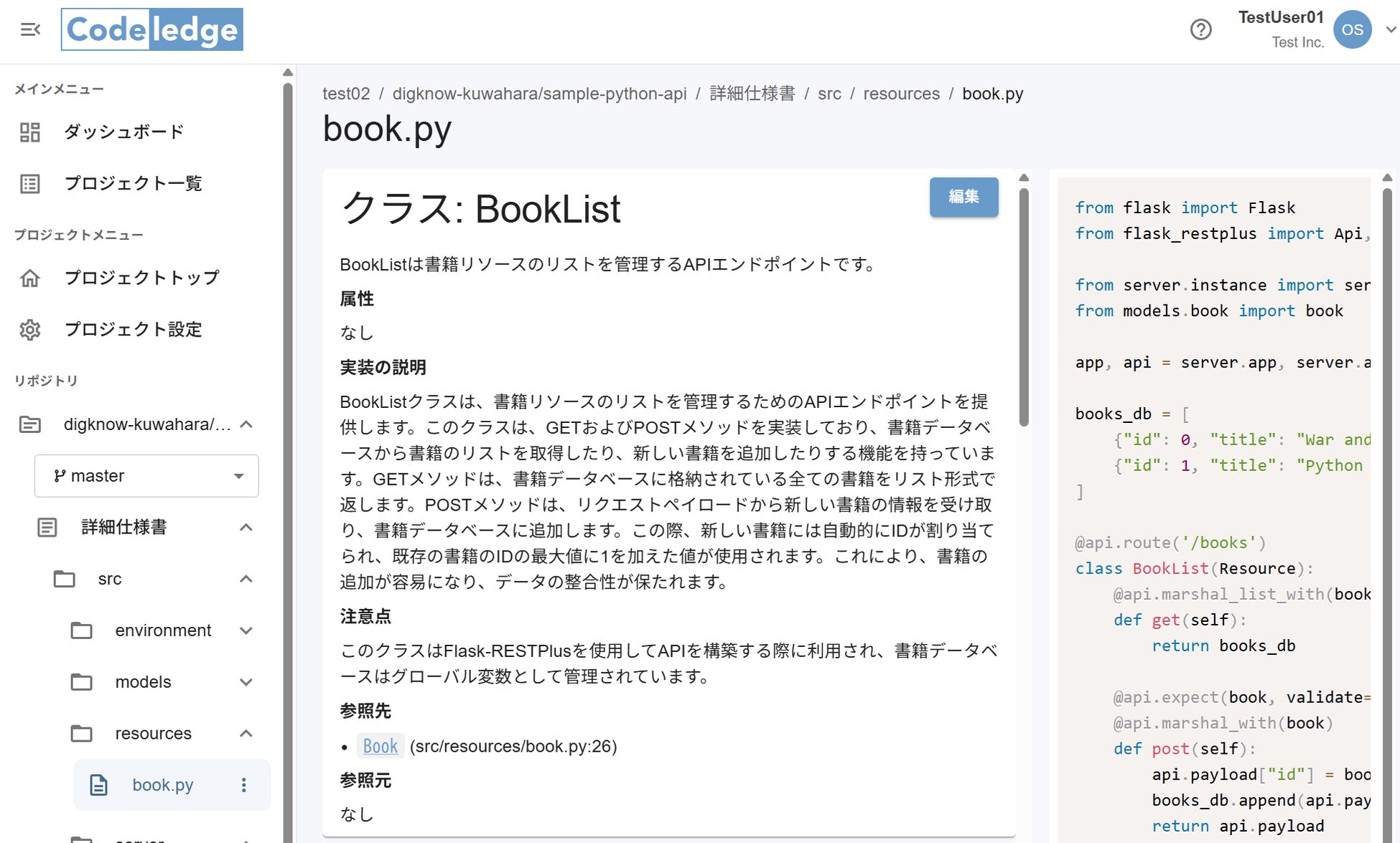 「Codeledge(コードレッジ)」は、技術ドキュメントの自動生成に特化したサービスです。GitHubなどのリポジトリを連携するだけで、AIがソースコードを自動解析し、詳細仕様書やフローチャート図、シーケンス図のような技術ドキュメントを自動生成・自動更新します。