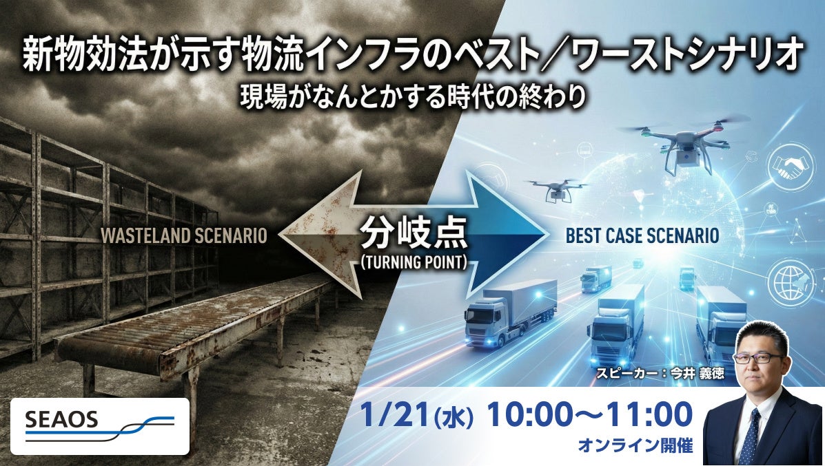 ロジスティクス領域に特化したコンサルティング、システム開発、業務支援を行うシーオス株式会社(本社:東京都渋谷区、代表取締役:松島 聡、以下シーオス)は、改正物流効率化法(新物効法)の施行に伴う物流環境の変化と、企業が直面するリスク・機会を解説する無料オンラインセミナー「現場がなんとかする時代の終わり - 新物効法が示す物流インフラのベスト/ワーストシナリオ」を2026年1月21日(水)10:00-11:00に開催いたします。