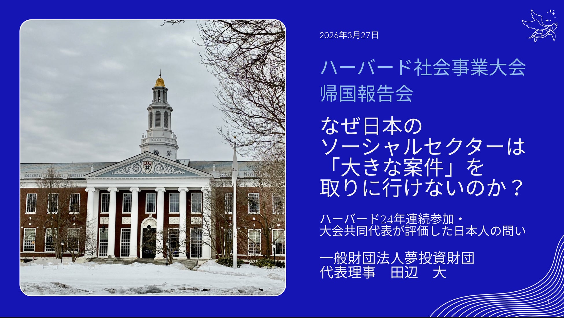 一般財団法人夢投資財団(所在地:長野県飯田市、代表理事:田辺 大)は、2026年3月27日(金)19:00〜21:00、オンライン(Zoom)にて「ハーバード社会事業大会 帰国報告会」を開催しました(参加申込者28名)。代表理事の田辺大が、米国ハーバード大学で2月28日〜3月1日に開催された社会起業分野の世界大会 Social Enterprise Conference(SECON2026、参加者約300名)での学びをもとに、日本のソーシャルセクターの持続的発展に向けた提言を行いました。単年度ごとに予算や成果がリセットされる構造が非営利セクターの閉塞を招いているとし、時間を味方にしながら社会的価値を複利的に増幅する「複利思考」と、その実践に不可欠な「仕組み」の重要性を説くものです。