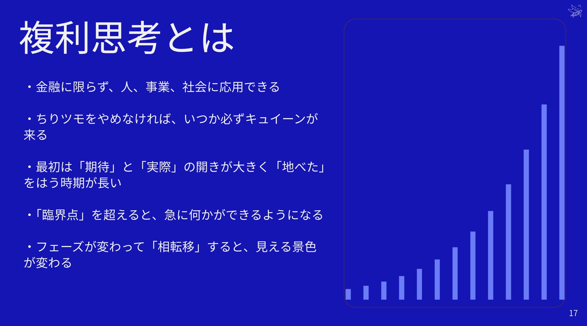この構造の対極にあるのが「複利思考」です。金融で知られる複利の概念を、人の成長・事業運営・社会変革に応用する考え方であり、短期的な成果が見えにくい初期段階を耐え抜き、小さな改善を積み重ねることで「臨界点」を越え、加速度的な変化が生まれるという原理に基づいています。帰国報告会では好例として菊池雄星投手のインタビュー動画も紹介されました。