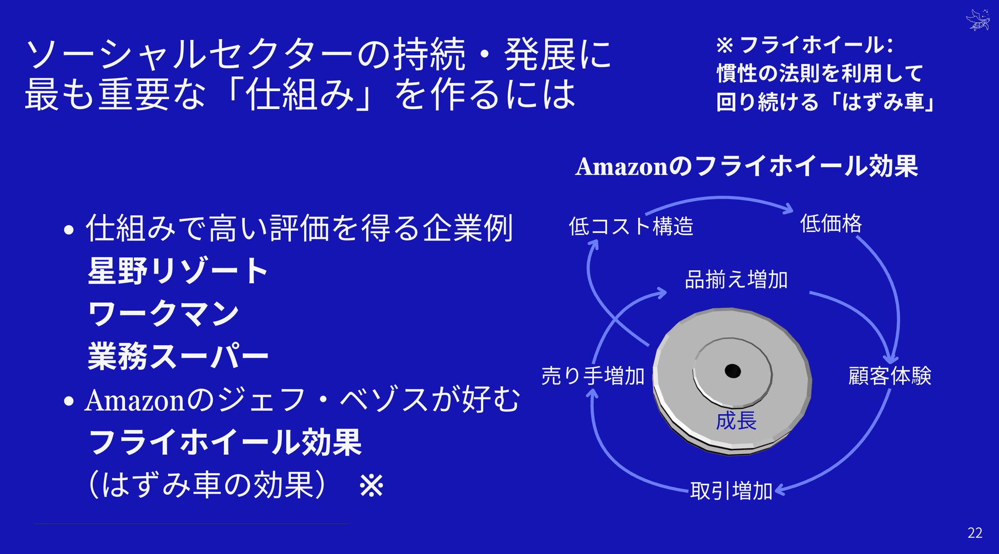 さらに、日本のソーシャルビジネスの事例として、マザーハウスの事業モデルをフライホイール効果で読み解きました。途上国での根気強い人材育成と高品質の生産→日本での高付加価値販売→顧客体験の創出→ブランド信頼の蓄積→利益の安定→人材・商品・設備への再投資──この循環こそ、非営利セクターが学ぶべき「仕組み」であると説明しました。