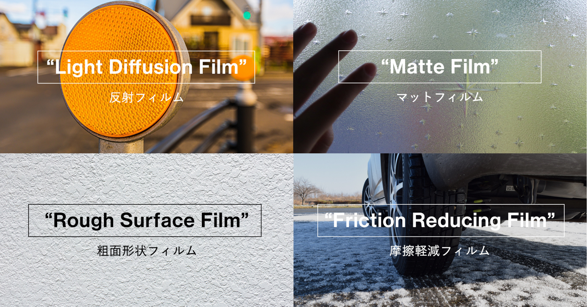 エンボス加工で凹凸を付与することで、光拡散・艶消し・マットフィルムを作成できます。