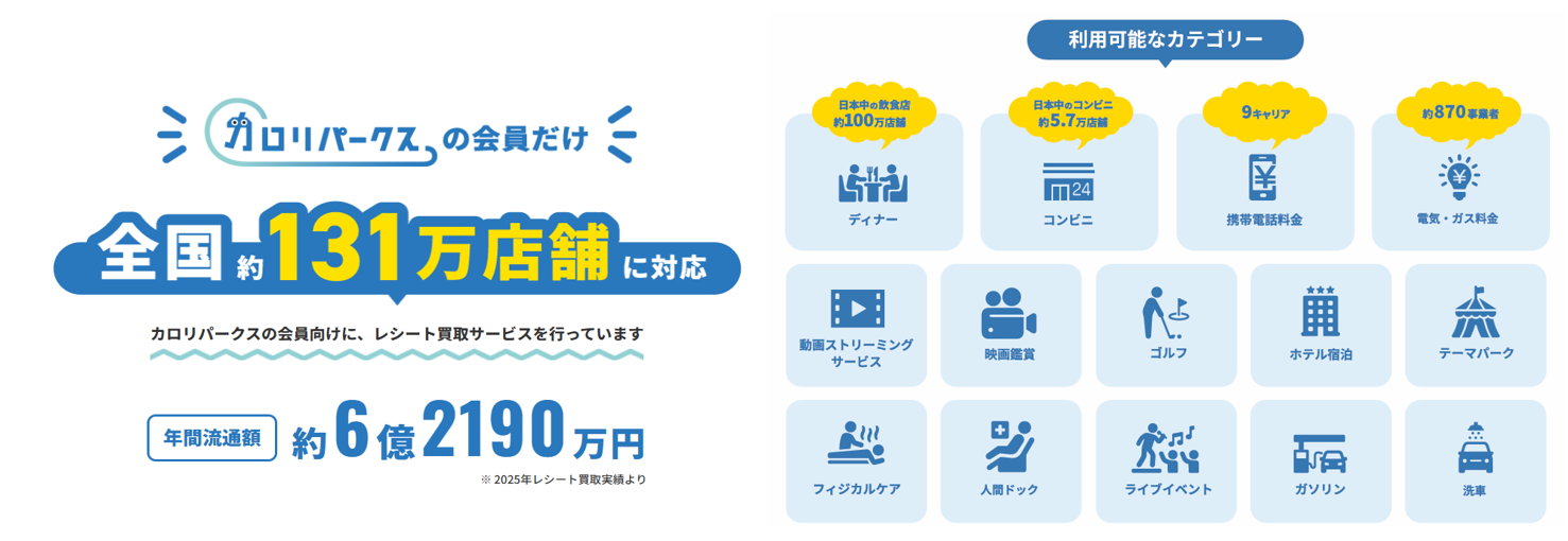 会員を対象に、日常生活で使う光熱費・通信費・コンビニなどのレシートをマーケティング調査として買い取る仕組みを導入(※給与所得には該当しません)。年間流通額は約6億2,190万円(2025年実績)と、多くのユーザーに活用されています。対象は全国約131万店舗・施設あるため、 「特別な施設を探さなくても、いつものお店で使える」実用性の高さが支持されています。