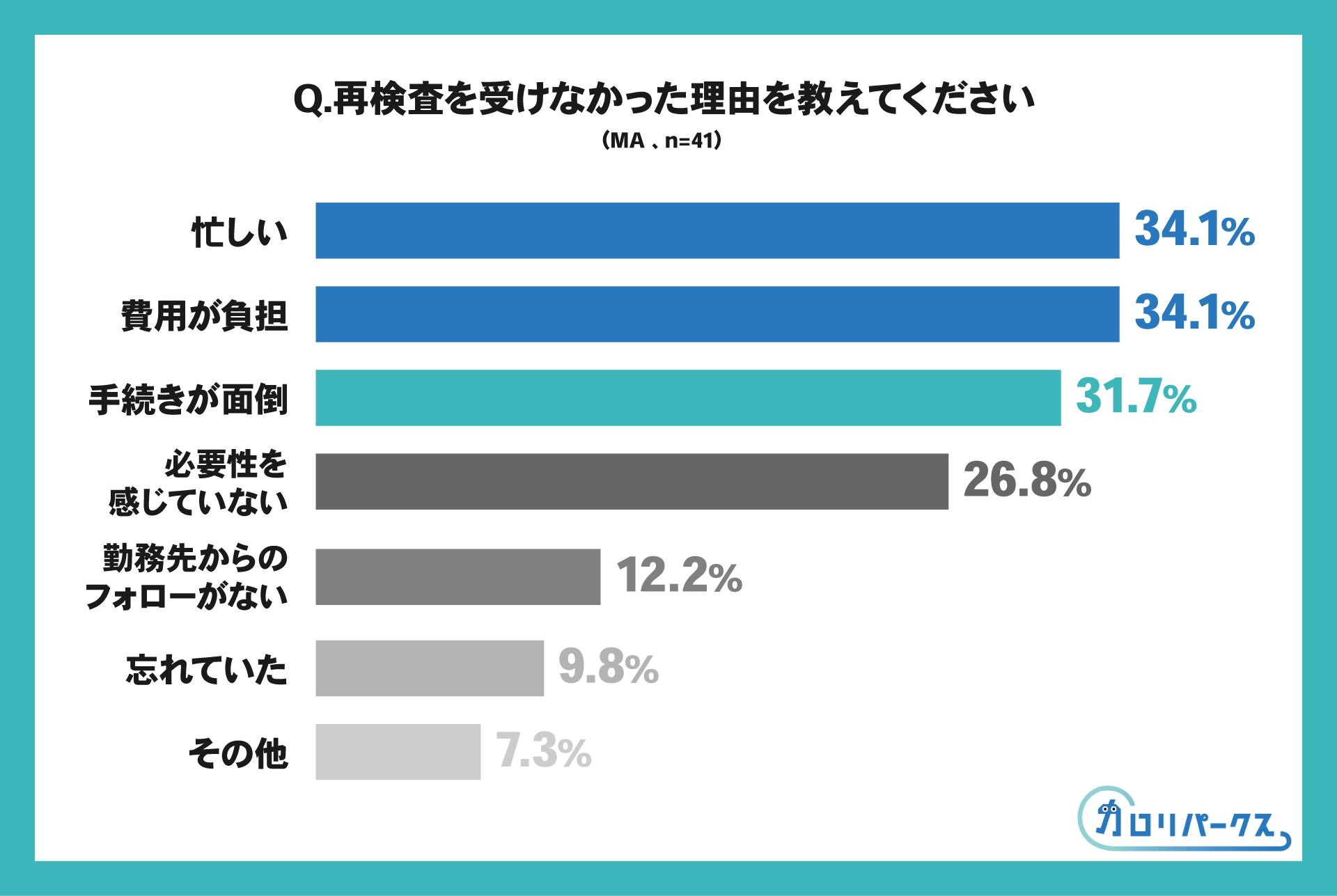 再検査を受けない理由としては、3割以上が「忙しい」「費用が負担」「手続きが面倒」と回答し、時間的・経済的・心理的な負担が受診の障壁となっていることが明らかになりました。