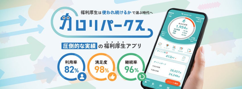 「カロリパークス」は、スマートフォンアプリを活用した福利厚生サービスです。従業員の健康増進をサポートする機能と、日々の生活を豊かにするサービスを組み合わせることで、企業の健康経営をサポート、従業員の満足度と定着率向上に貢献します。導入企業では、利用率82%・満足度98%・継続率96%(2024年自社調べ)という高い実績を誇り「導入しただけで終わらせない、“届く福利厚生”」として注目を集めています。