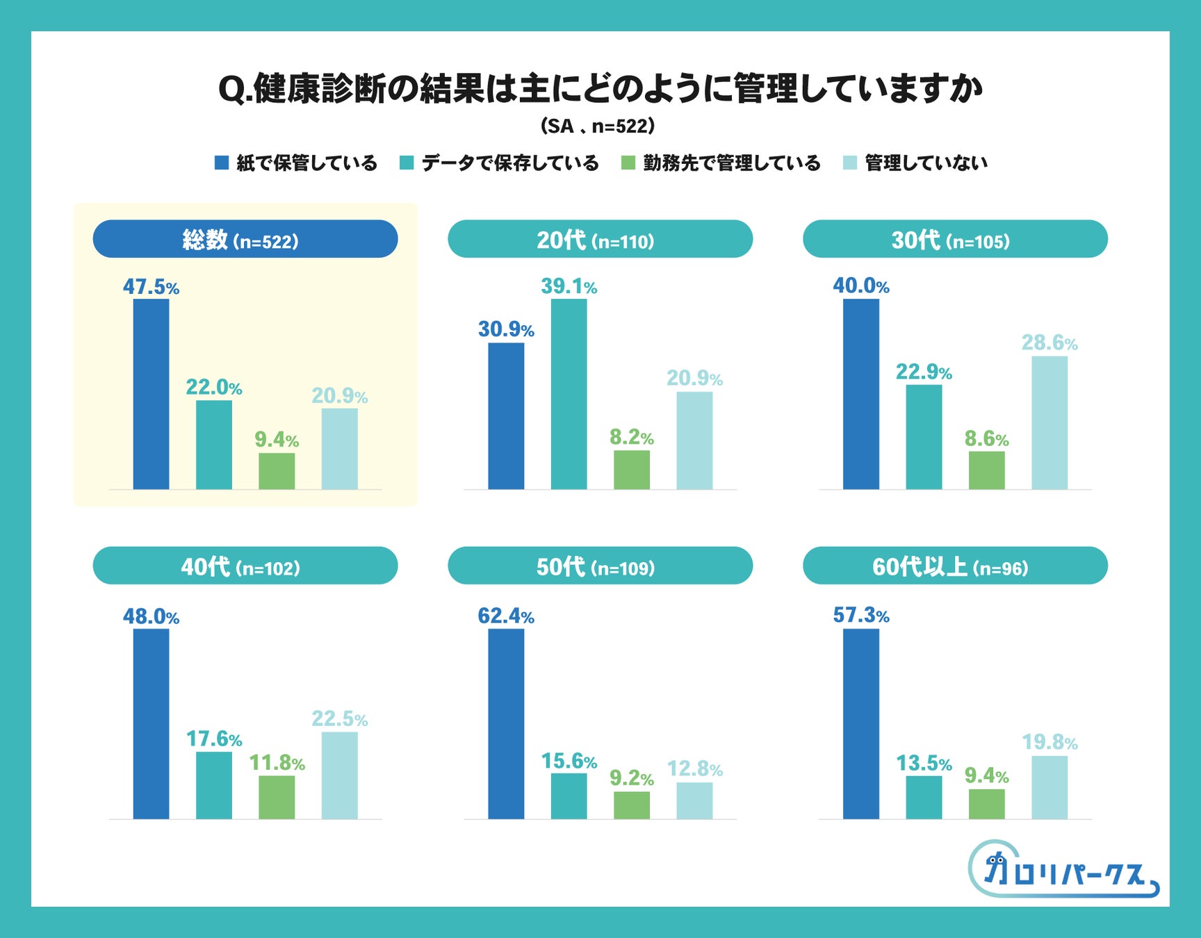 また、「管理していない」層も各年代で約2割存在し、「勤務先で管理」は全体的に1割前後にとどまりました。