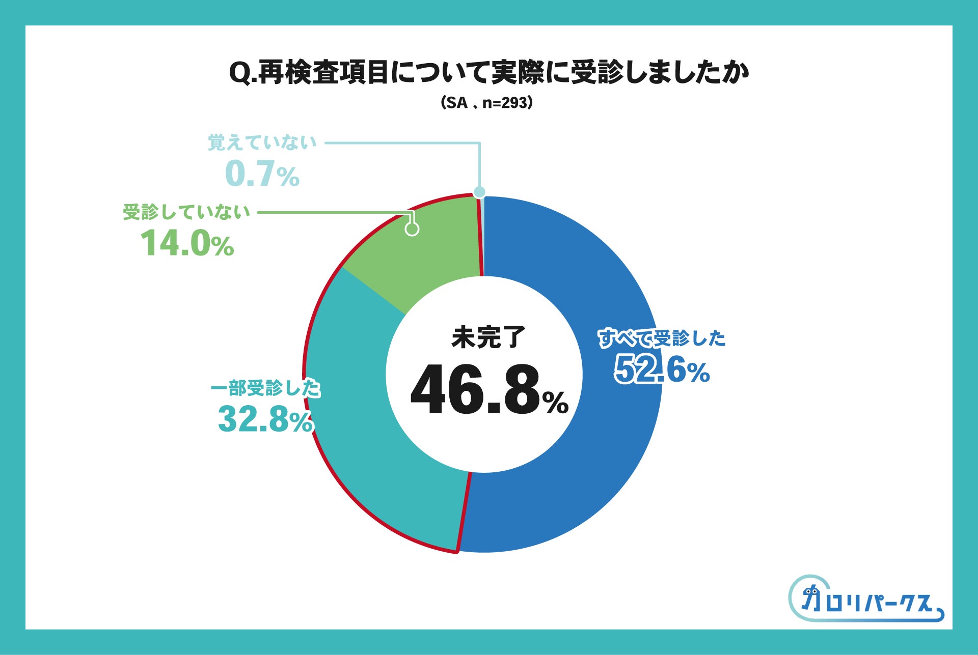 健康診断で再検査項目が出た人に実際に受信したかをたずねたところ、「すべて受診した」52.6%にとどまり、46.8%が未完了と回答しました。(「一部受診した」32.8%、「受診していない」14.0%)の合算)