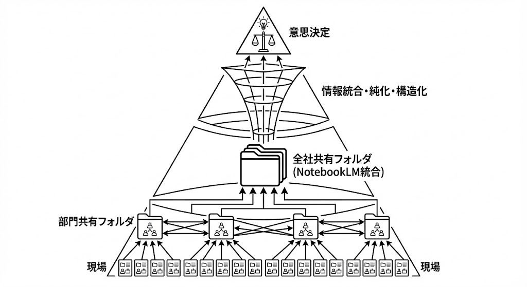 上司は自らすべての会議に参加することなく、NotebookLM経由で部下のログを横断的に読み解くことで、現場で何が起きているかの「真の全体像」を即座に把握する。 -