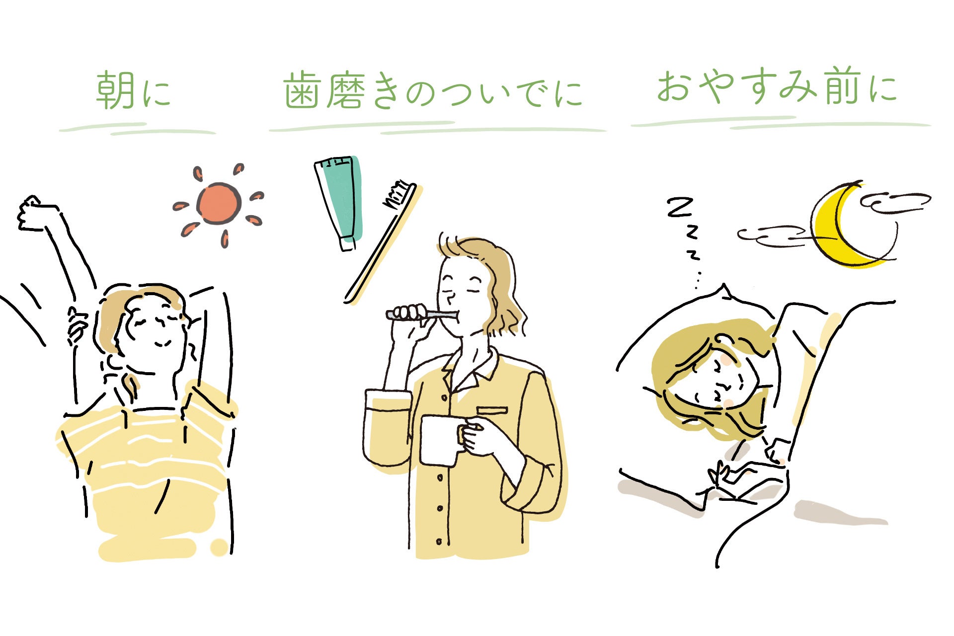 飲むタイミングは、朝・歯磨きのついで・おやすみ前など、あなたのライフスタイルに合わせて自由に設定していただけます。