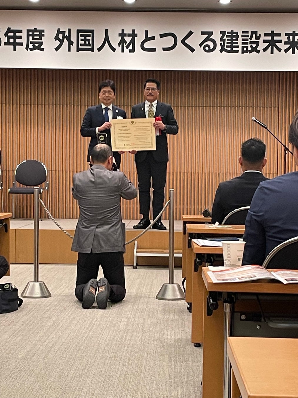 当社が受賞した「未来への取り組み賞(外国人材活躍優良事例部門)」は、建設業に従事する外国人材に関連して、地域社会との共生等の継続的な取組を表彰する部門です。今年度は、全国でわずか5社のみが選ばれ、宮崎県の企業としては唯一であり、初の受賞となります。