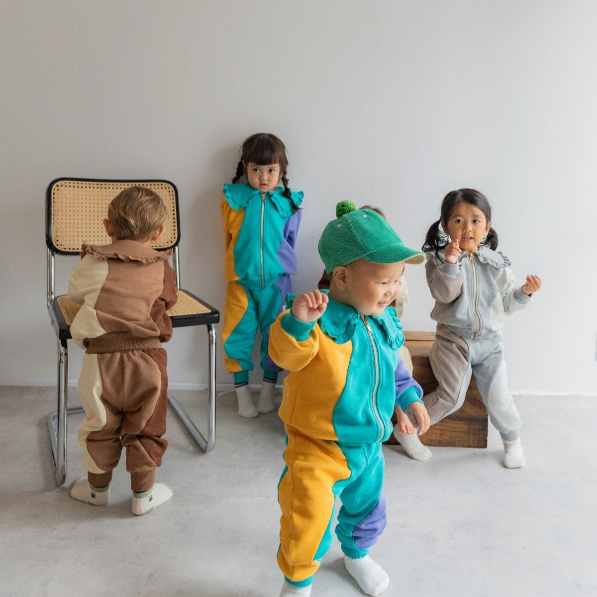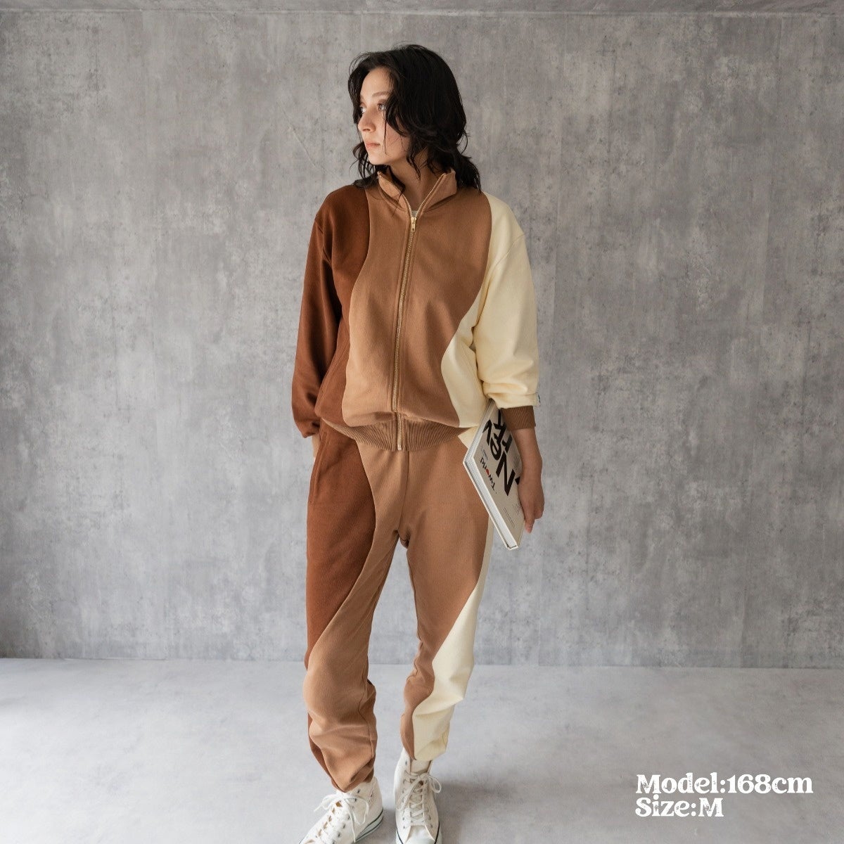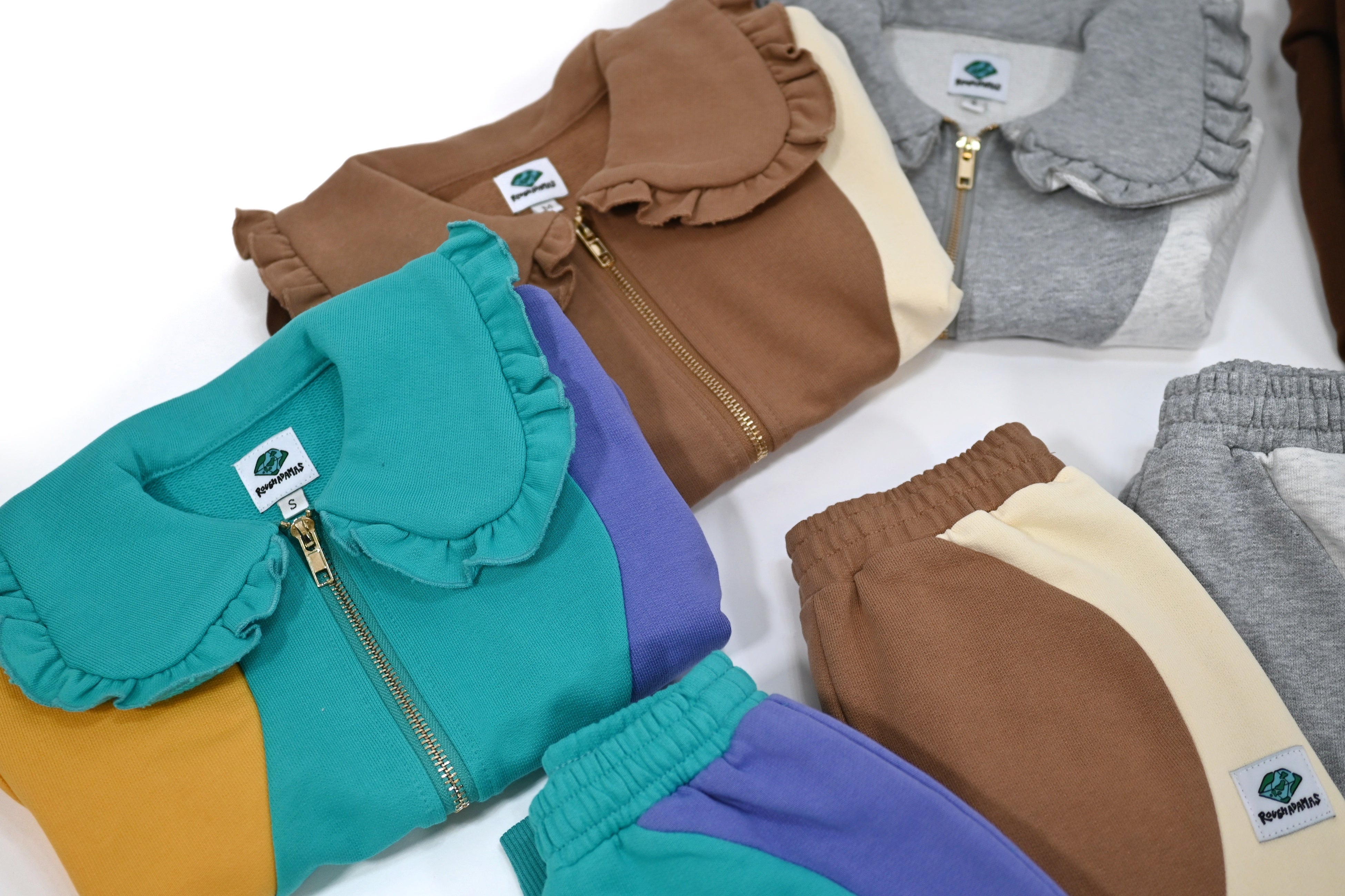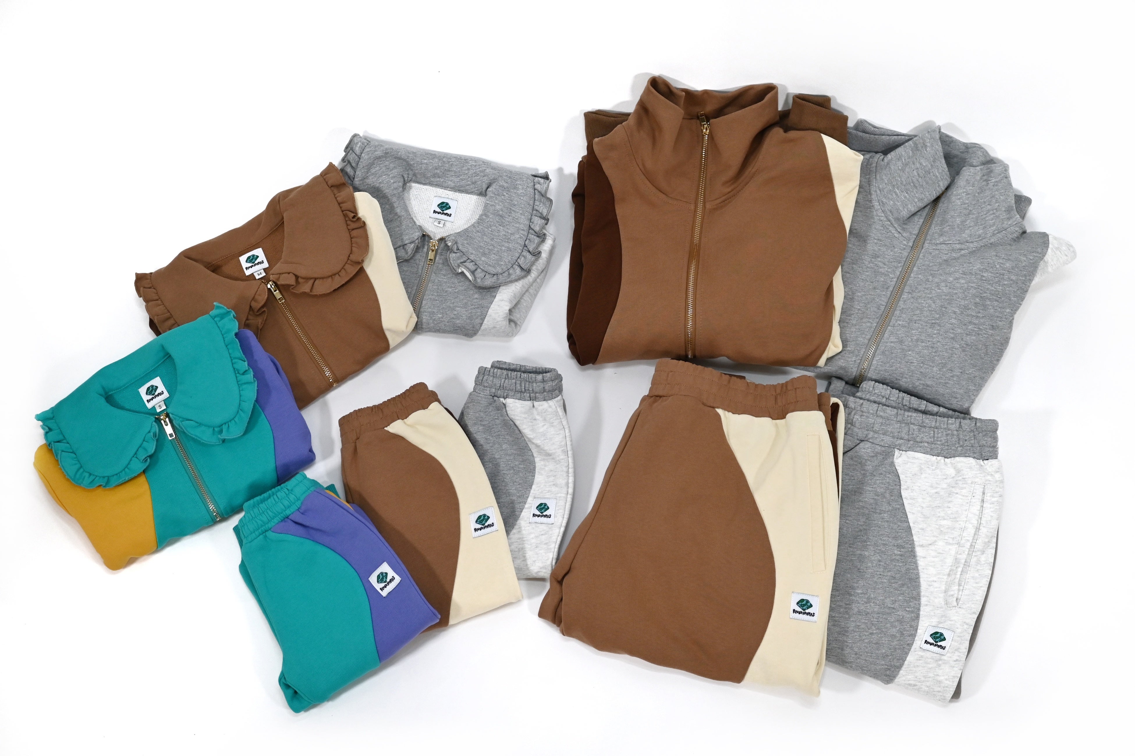 という想いを体現した贅沢に3色のスウェット生地を使用したオリジナリティ溢れるウェーブデザインとフリルの襟が特徴的なスウェットセットアップのコレクション。