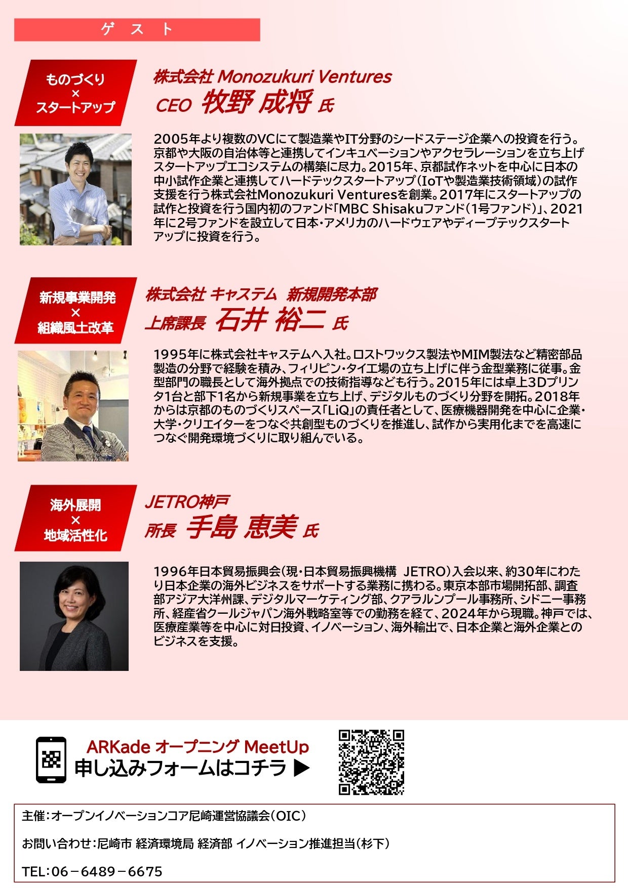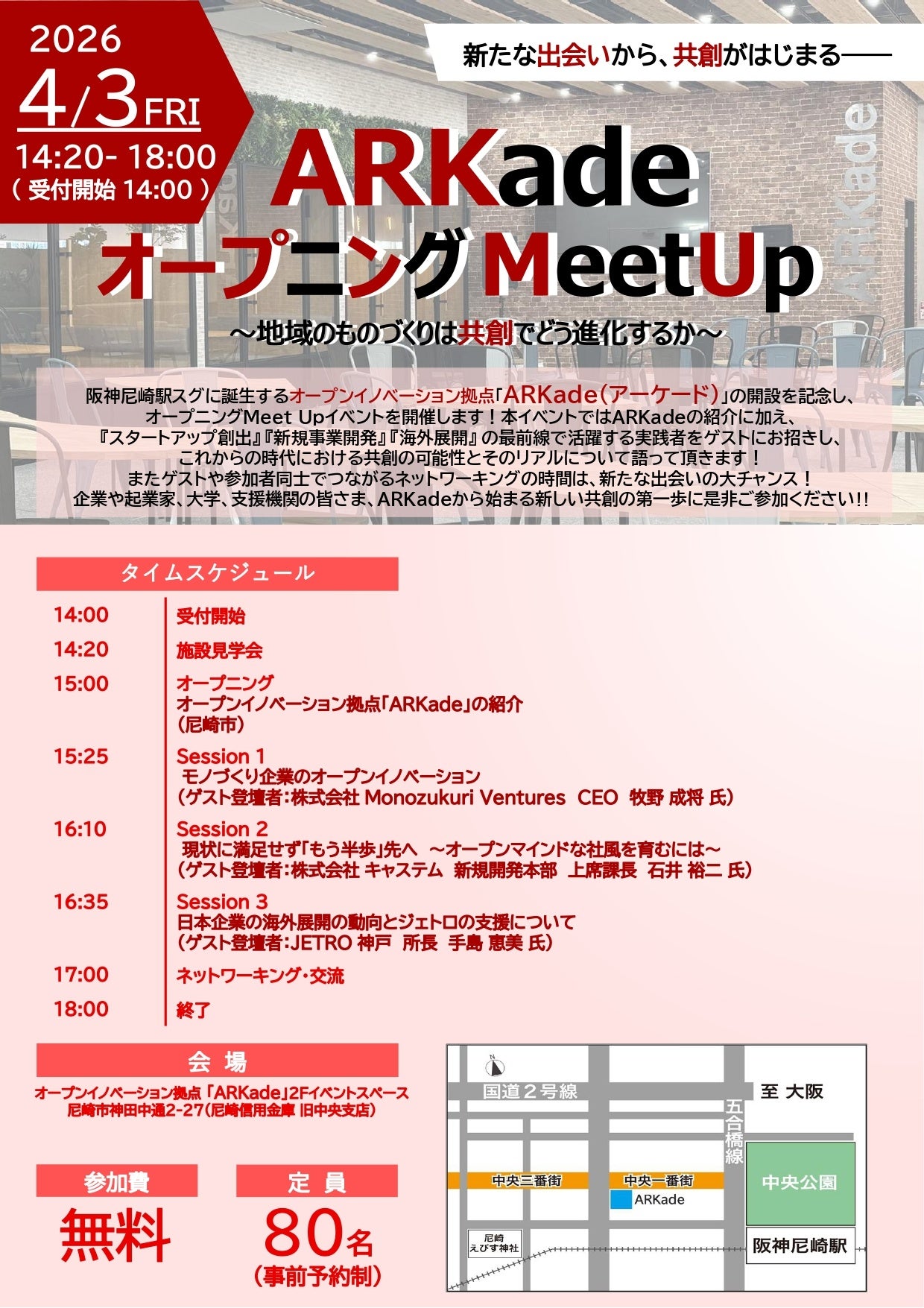オープンイノベーション拠点ARKadeの開設を記念し、下記のとおりオープニングイベント「オープニング Meet Up ~地域のものづくりは共創でどう進化するか~」を開催します。