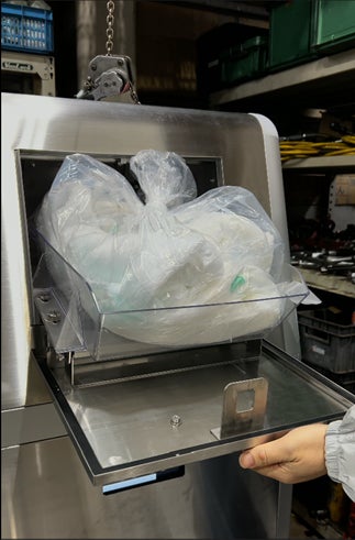 ボリュームタイプの操作もこれまでどおりにシンプル。汚物が入ったままの紙おむつを投入してスタートするだけ。10個の紙おむつが入った大きなごみ袋のままで一気に投入OKなのもユーザーにはうれしい仕様です。あとはDeasyCareが自動で処理を進めます。従来と違うのは、内部の動きだけ。内部では2〜3個分ずつ順に破砕・中和・脱水を繰り返し特に操作は必要ありません。2個ずつ投入する場合と変わらず、約30分後には処理が完了します。