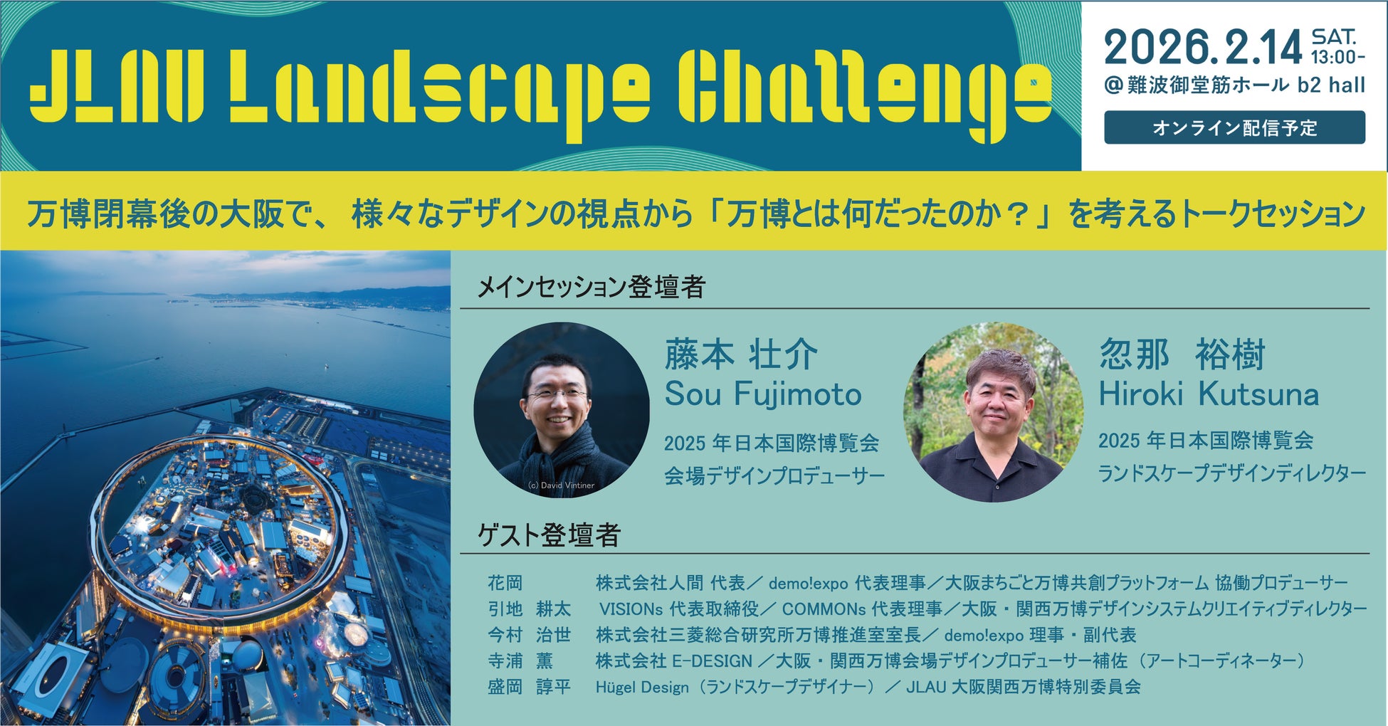 JLAU (一般社団法人ランドスケープアーキテクト連盟) は、2/14(土)に大阪難波御堂筋ホールにて『万博とは何だったのか?』をテーマに、会場デザインプロデューサーを務められた藤本壮介氏とランドスケープデザインを手がけた忽那裕樹氏 (JLAU副会長) によるトークセッションを開催いたします。プログラム後半では、自分たちの街を万博会場に見立てその価値を街に残す活動を行う「まちごと万博」、万博の跡地利用や大阪市全体のまちづくりを構想する「GREEN ARROW」に関するセッションも行います。