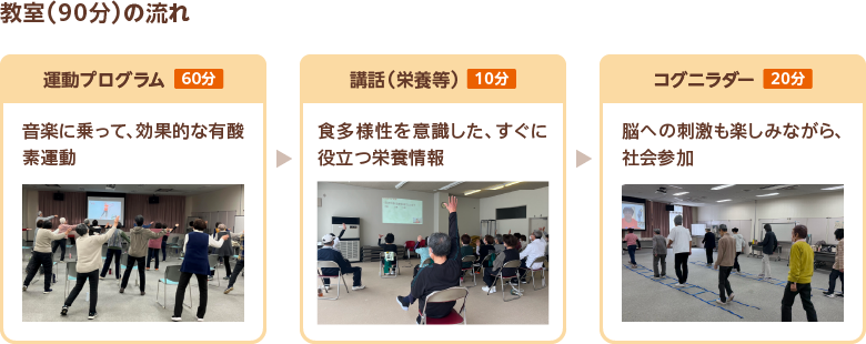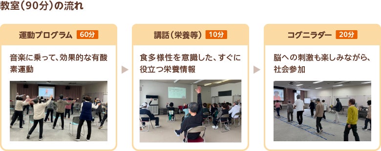 国の指針*に沿った認知機能低下予防のための「運動」「脳トレ」「栄養」「交流」をワンパッケージで提供する、独自のノウハウに基づいたプログラムです。
