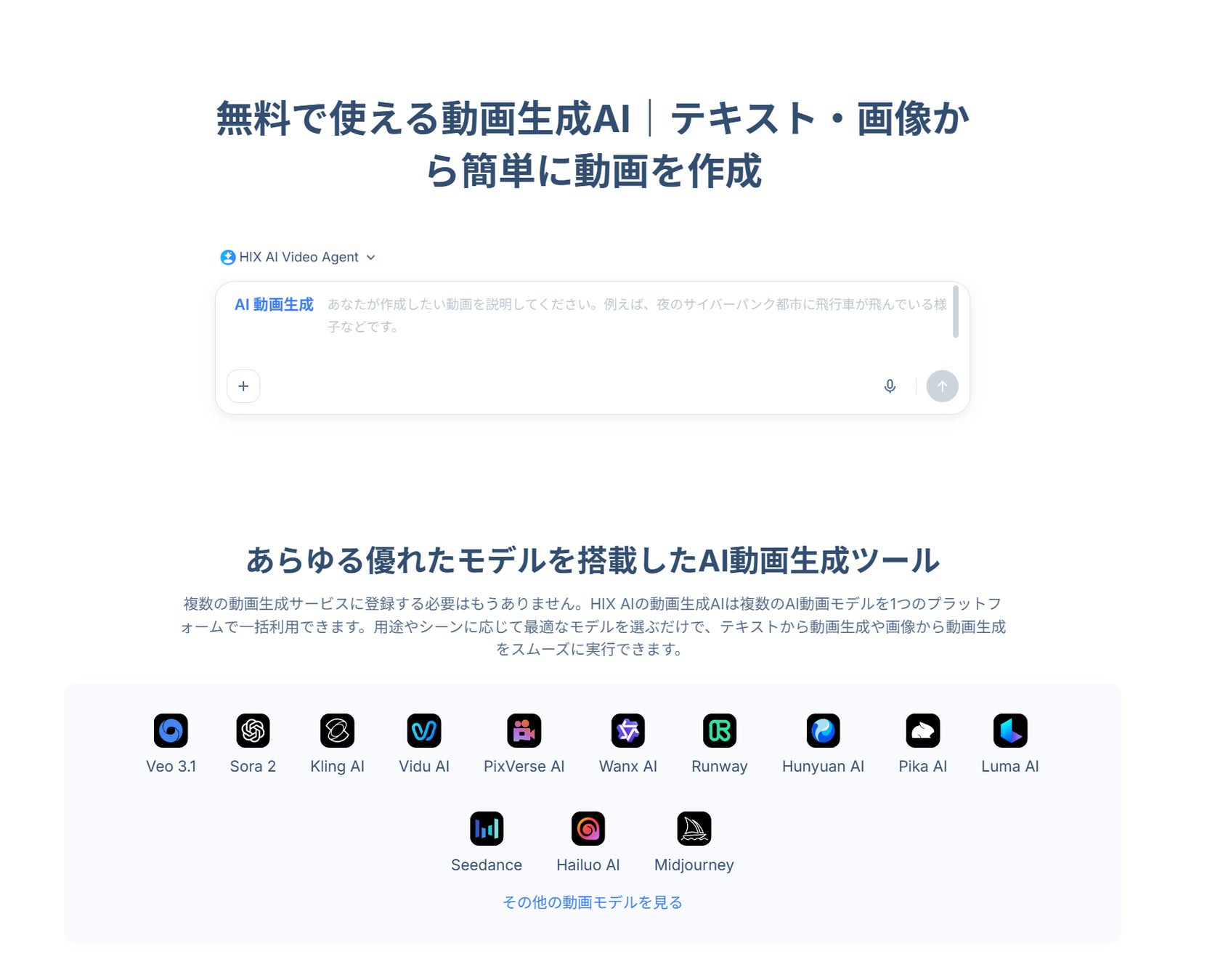 HIX AIの動画生成AIはSora、Veo、Kling AI、Runwayなど、最先端の動画モデルを搭載し、テキスト・画像から簡単に動画を作成できるサービスです。専門的な設定やモデル選びは不要で、動画の目的・内容・スタイルに応じて、最適な動画生成AIを自動で使用します。