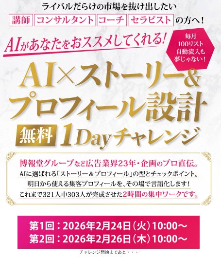 株式会社ライフワーカー&アソシエイツ(本社:東京都、代表取締役:芳月健太郎)は、2026年2月11日に発売し、Amazon「起業家」「経営学」「女性と仕事」部門でランキング1位を獲得した新刊『AIブランディング』(Kindle版)の出版を記念し、同書のメソッドを実践するオンラインセミナー『AI×ストーリー&プロフィール設計 1Dayチャレンジ』を、2月24日(火)・26日(木)の2日間限定で開催いたします。参加費は無料です。