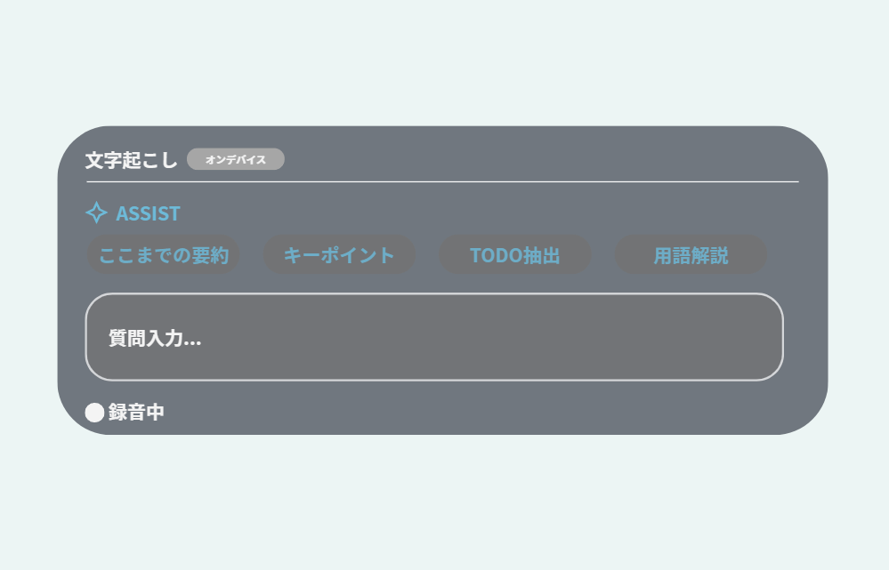 「ここまでの要約」「キーポイント抽出」「質問提案」などをリアルタイムで提示し、会議や講義中の理解をサポート。