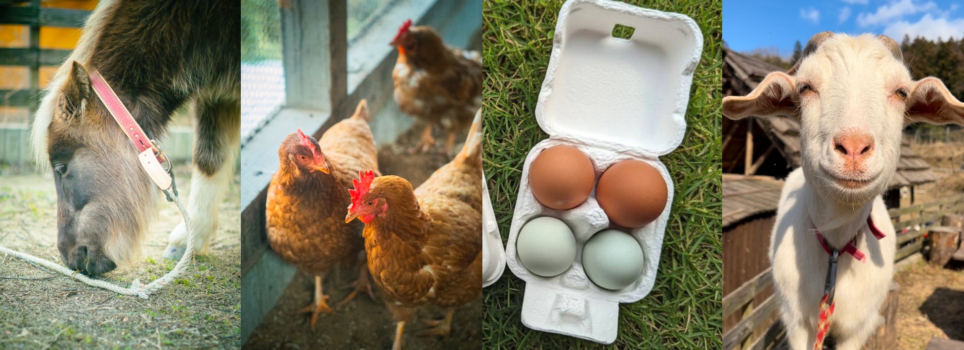 施設内にはヤギやミニチュアホース、鶏などの動物たちが暮らしています。