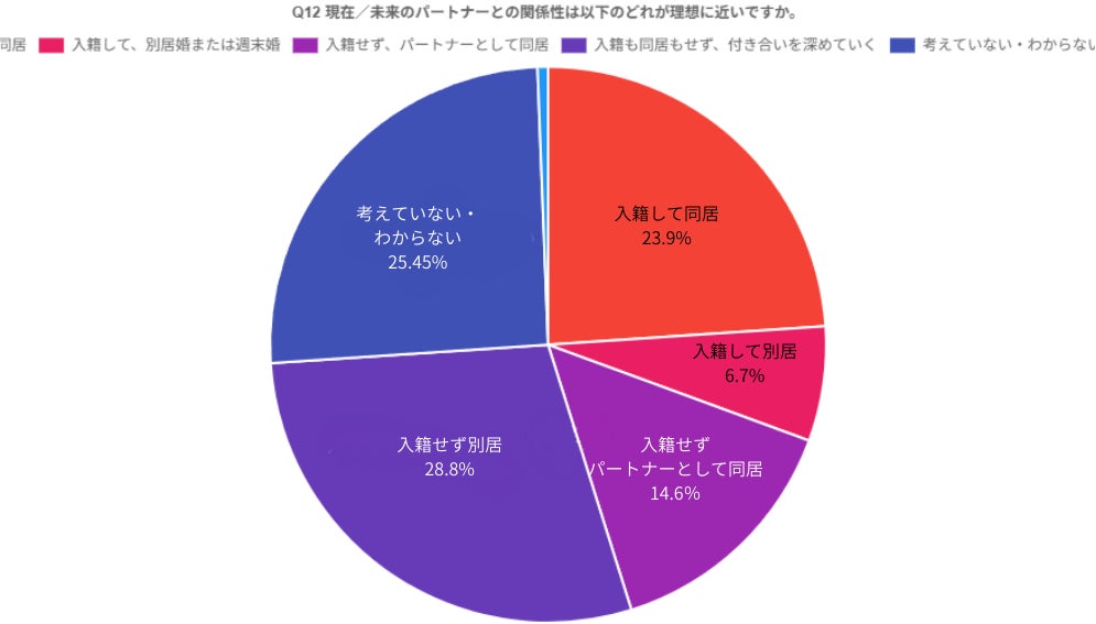 興味深いのは、入籍(別居/同居含む)を想定している人が3割(30.6%)に対し、入籍しないパートナーシップを考えている人が4割強(43.4%)と12ポイント以上高いことです。