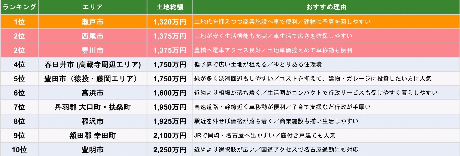 その他、上位には中心部よりも同予算で広い土地が狙えるエリアが並び、5位の春日井市(1,750万円)は「60坪以上も視野に入る」点が特徴。また、6位の豊田市(1,750万円)は「緑が多く土地が広い」「渋滞回避ルートがある」など、暮らしやすさとセットで評価され、土地コストを抑えて“建物やガレージ等のこだわり”に投資する方々にも人気です。