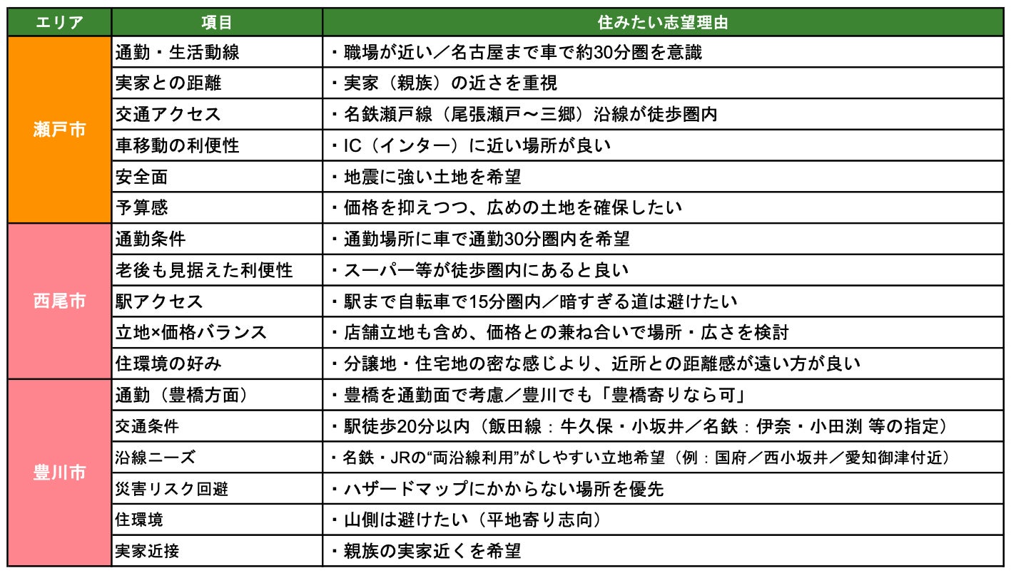 ・加えて、ハザード回避や地震への強さなどの安全面、山側を避けたい、暗い道は避けたい、住宅密集より適度な距離感を保ちたいといった住環境の好みによる絞り込みも確認されました。なお、同一市内でも町名レベルで希望を指定するケースや、逆に特定エリアを除外する条件が挙がるなど、エリア選びがより“具体化”している点も特徴です。