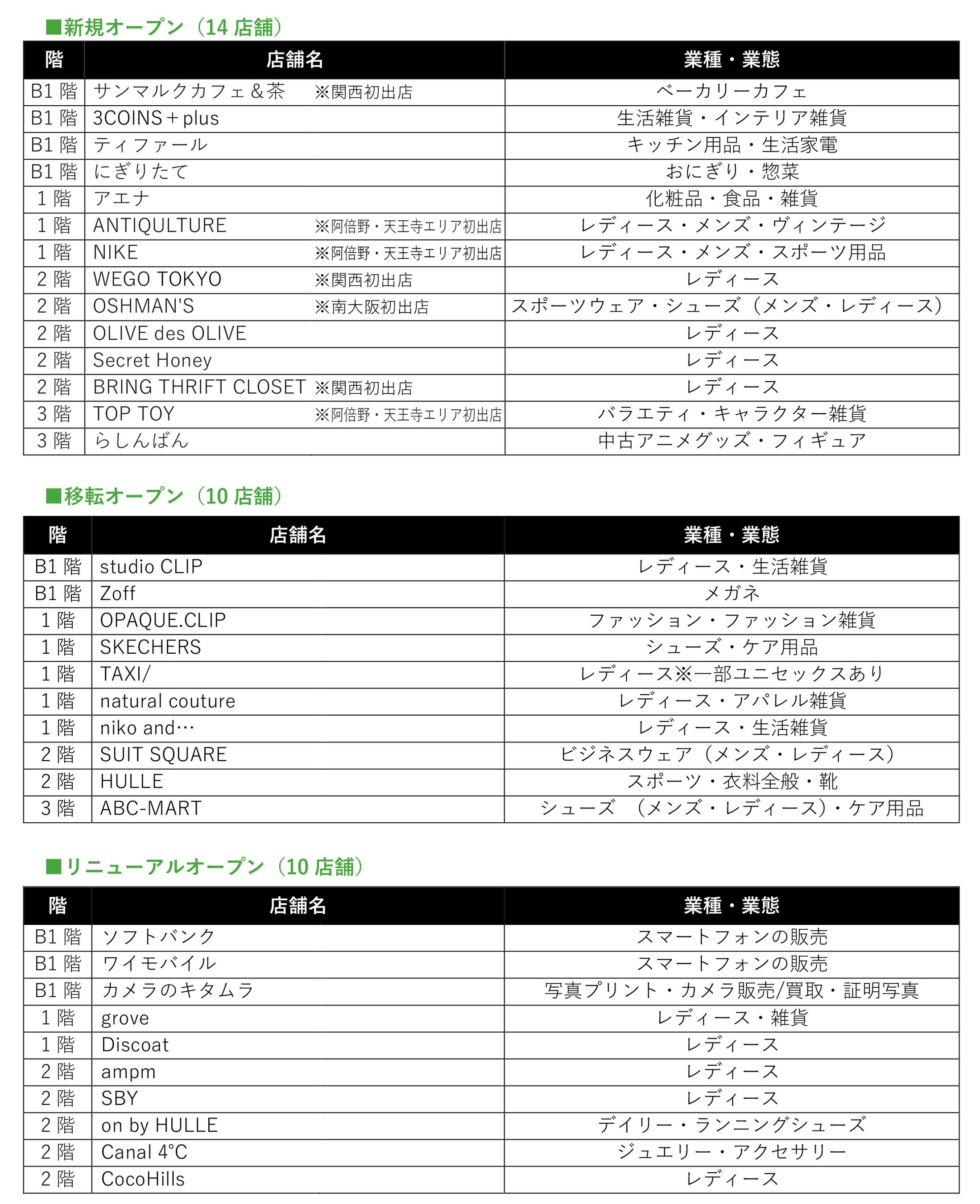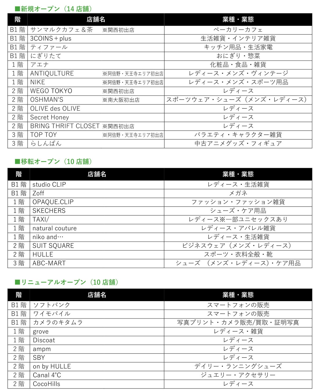また、地域の皆様の日常により寄り添う施設をめざして、2月より、関西初出店となる「サンマルクカフェ&茶」「WEGO TOKYO」「BRING THRIFT CLOSET」や、阿倍野・天王寺エリア初出店の「NIKE」、南大阪初出店の「OSHMAN'S」など、話題の14店舗が新たにオープンします。移転・リニューアルも含め全34店舗が、7月上旬までに順次オープンする予定です。