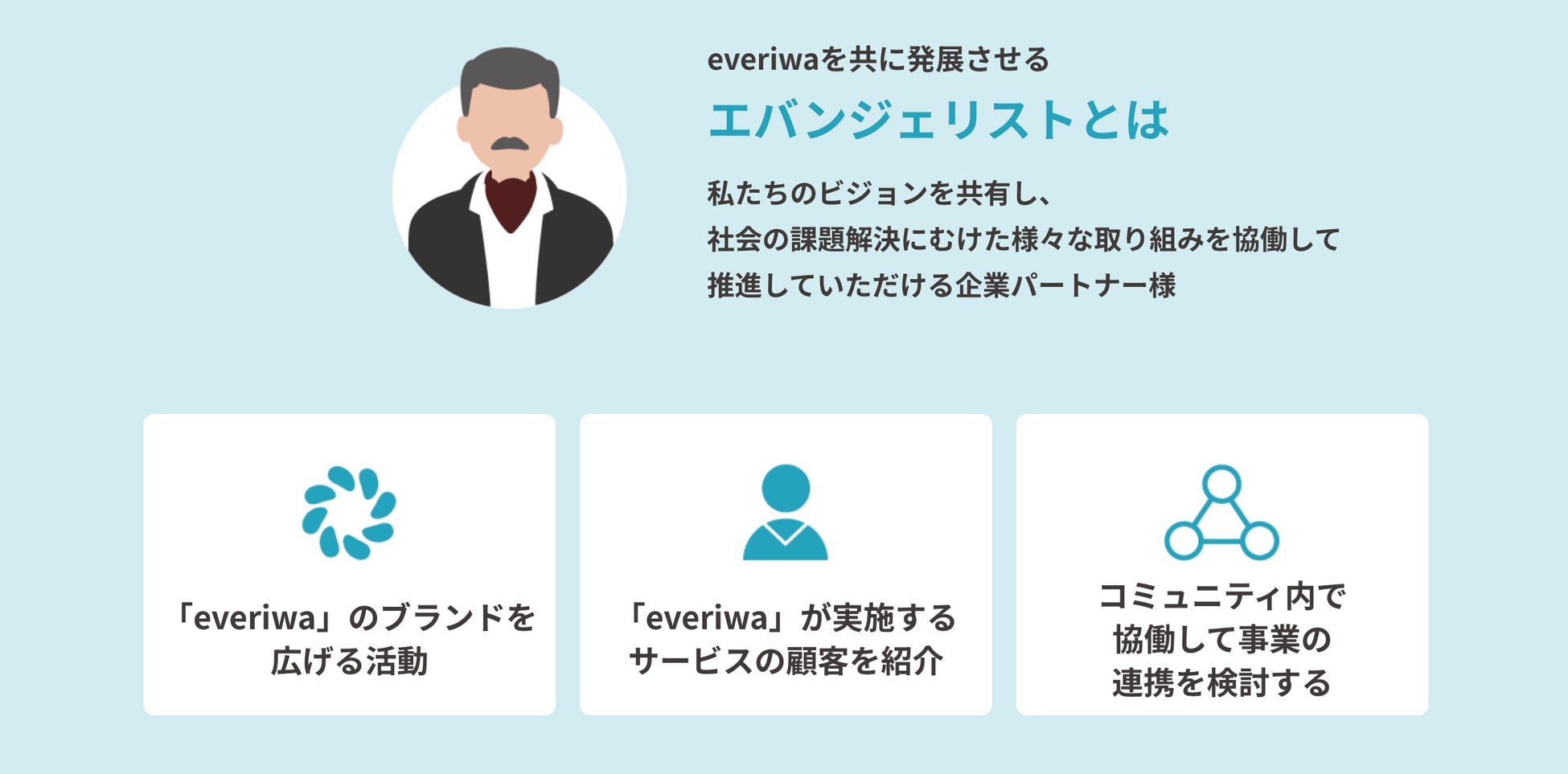 エバンジェリストとは、everiwaのビジョンに共感し、社会課題の解決に向けた取り組みを協働して推進する企業パートナーです。
